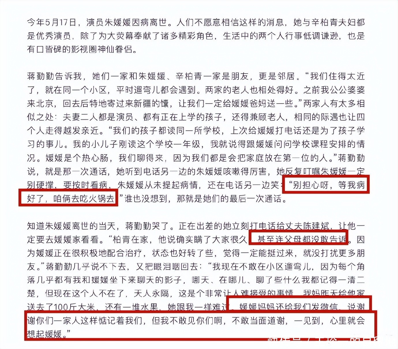 彼时辛柏青在家,辛柏青对陈建斌说朱媛媛的病瞒了大家很久,甚至连父母都没有告诉。