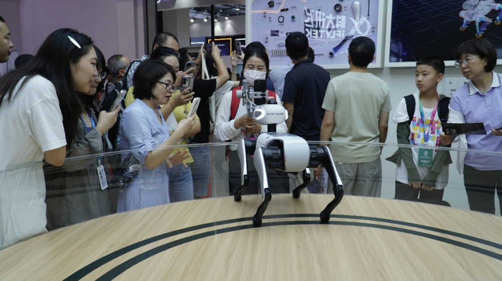 不只是仿真宠物,机械狗带来的“赛博遛狗”体验也吸引了众多观众。维他动力研发的智能伴随机器人正是以四足机械狗的形态出现。工作人员宋巍告诉记者,维他动力是国内首家消费级具身智能公司,此次展出的首款智能伴随机器人的独特之处在于它无需遥控器。
