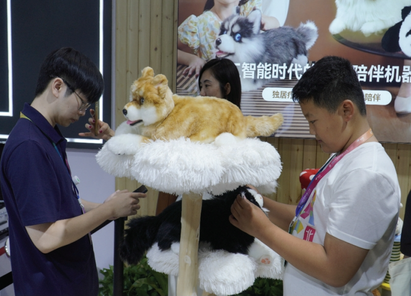 除了仿真宠物猫外,这家展台还展示了仿真熊猫、兔子、小狗等,让许多消费者爱不释手。有消费者说:“这简直是真宠物的完美替代,不用担心毛发过敏,也不用像养真猫一样操心。”也有消费者表示,虽然很心动,但目前的产品还是有些粗糙,等以后迭代升级,肯定会购买。